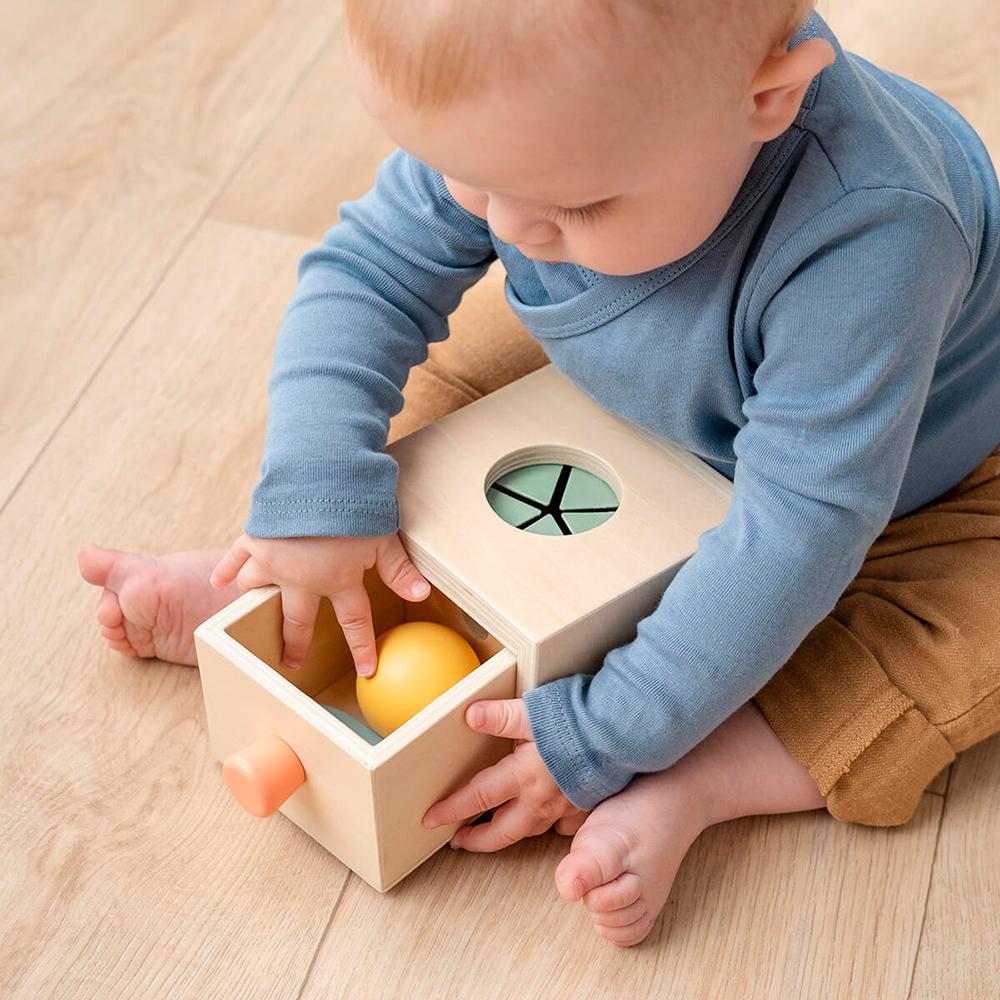 Una cajita de madera con apertura superior para guardar objetos y cajón para recuperarlos fácilmente, que invita a tu bebé a descubrir, experimentar y resolver pequeños retos mientras se divierte.Las piezas de distintas formas, el contraste de colores o una pelota con sonajero, estimulan sus sentidos y le incitan a guardar y sacar una y otra vez cada elemento.