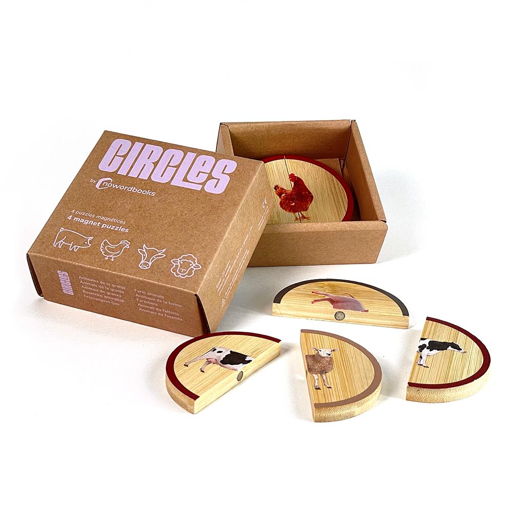 Set de cuatro puzles magnéticos de dos piezas con imágenes reales de animales de la granja divididos en mitades. Perfecto para que niños y niñas observen, relacionen las imágenes y se diviertan formando el animal correcto.