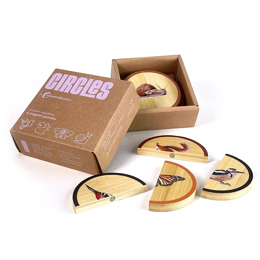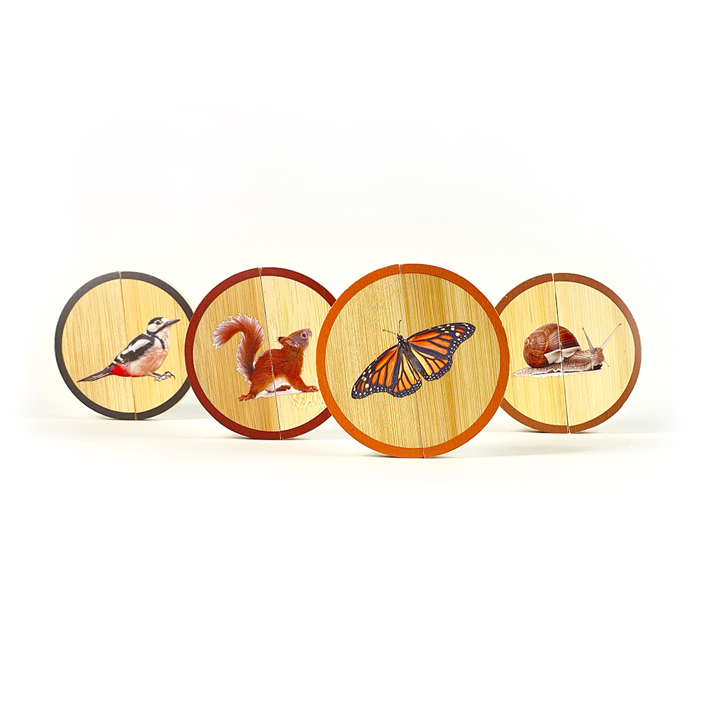 Set de cuatro puzles magnéticos de dos piezas con imágenes reales de animales del bosque divididos en mitades. Perfecto para que niños y niñas observen, relacionen las imágenes y se diviertan formando el animal correcto.