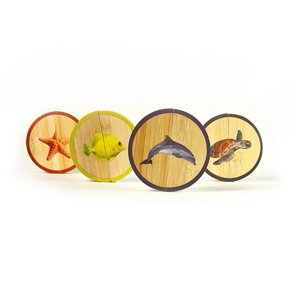 Set de cuatro puzles magnéticos de dos piezas con imágenes reales de animales marinos divididos en mitades. Perfecto para que niños y niñas observen, relacionen las imágenes y se diviertan formando el animal correcto.