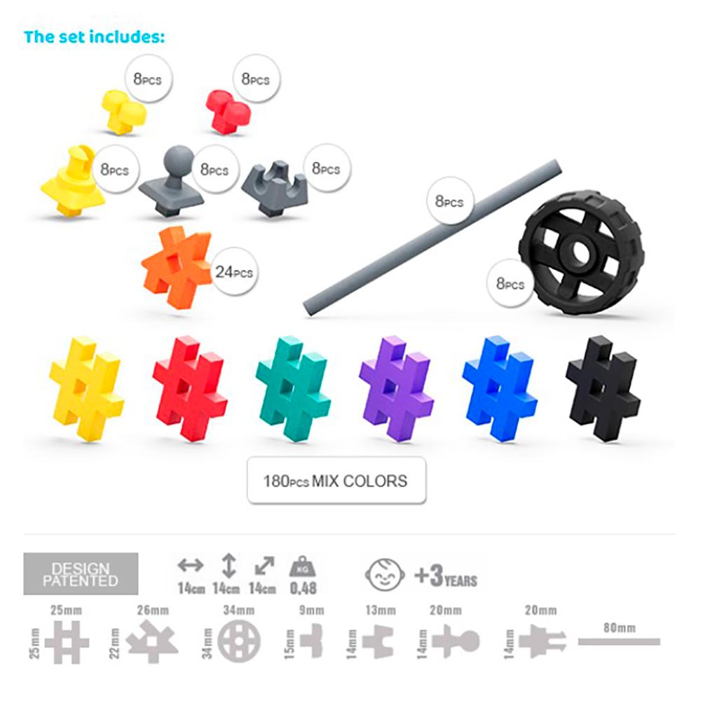 Construye multitud de figuras grandes con movimiento con este set. Podrás dar vida a una grúa, un todoterreno o cualquier invento que imagines.Contiene ruedas, ejes y distintas piezas móviles que permiten crear construcciones que invitan a experimentar.Puedes combinarlo con tus piezas Meli Basic para multiplicar la diversión, y reproducir los modelos del manual o inspirarte en ellos para construir lo que imagines.