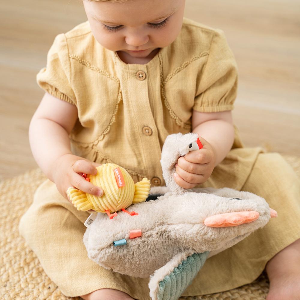 Este juguete de actividades en forma de una encantadora gallina y sus pollitos, invita a tu bebé a explorar despertando sus sentidos. Adorará jugar a esconder los pollitos dentro de la gallina para volver a sacarlos y repetir una y otra vez, mientras descubre el espejo escondido, las texturas, el mordedor y los distintos elementos manipulativos que incluye.Un diseño magistral que captará su atención desde el primer momento.