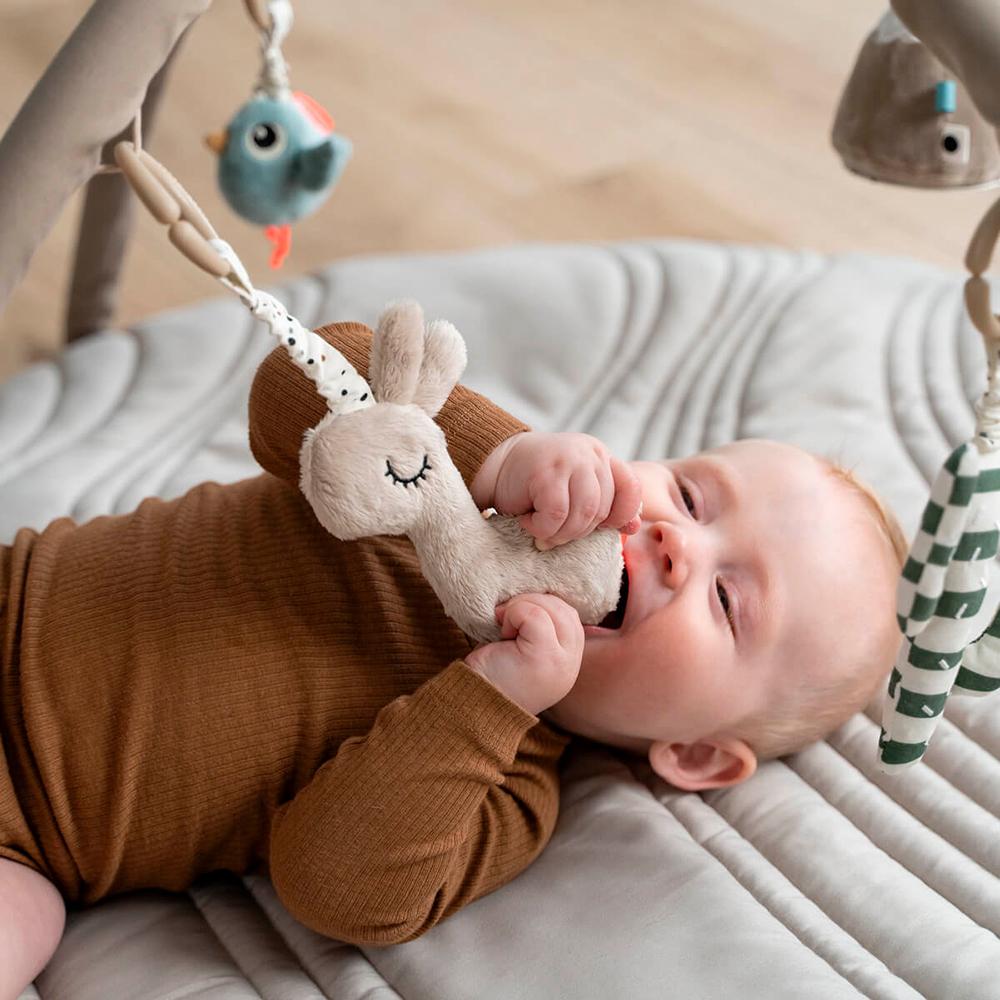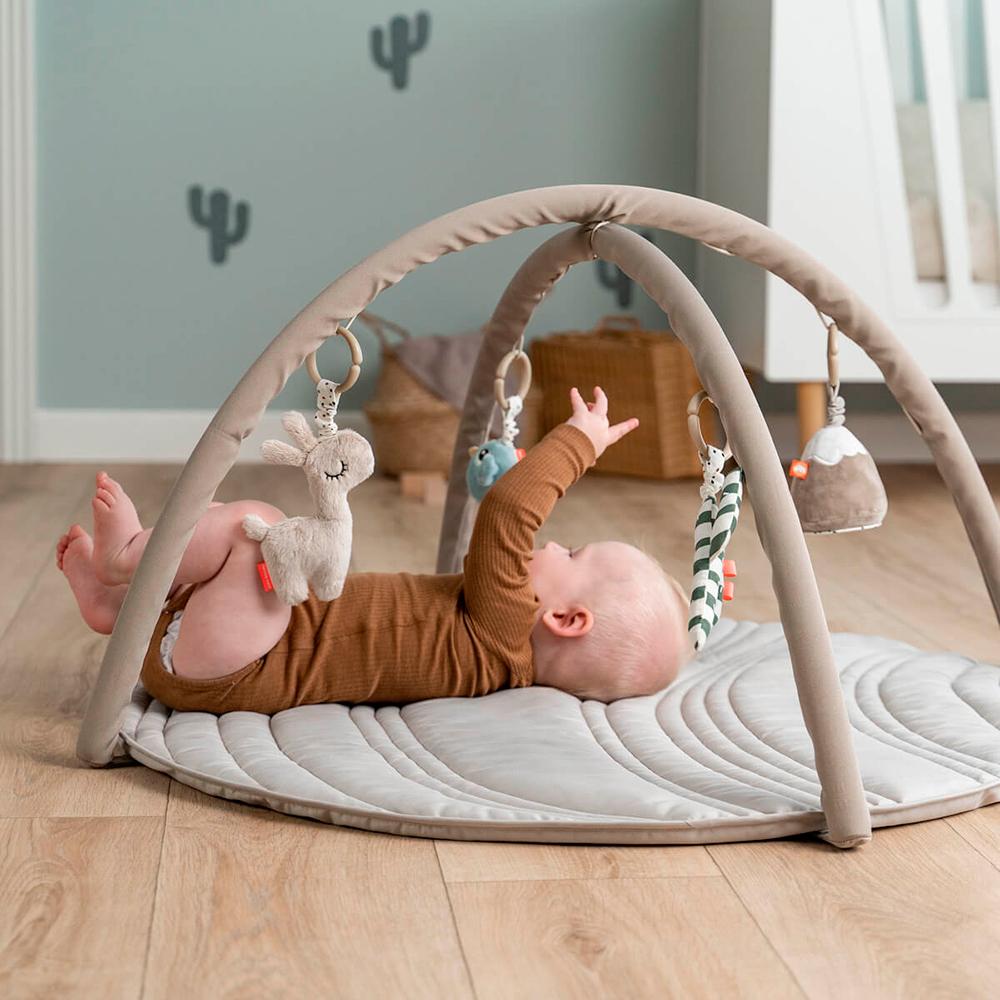 Incluye varios animalitos de tela diseñados para estimular sus sentidos con texturas, sonidos crujientes, sonajeros y un espejo que fomenta el reconocimiento y la curiosidad. Gracias a sus 13 posiciones ajustables, podrás colocar los juguetes en los arcos acompañando cada etapa de su desarrollo.