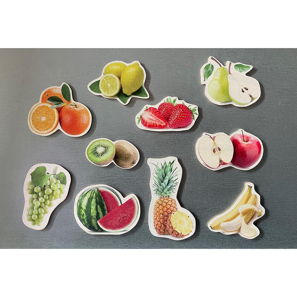 Se trata de un conjunto de diez figuras con imágenes reales de frutas impresas sobre bambú y magnéticas, perfectas para que niños y niñas dejen volar la imaginación y descubran nuevos alimentos.Son aptos para casi cualquier superficie metálica.
