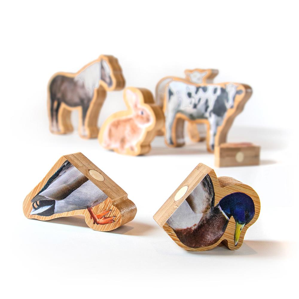 Se trata de un conjunto de ocho figuras de animales de granja divididas en mitades, impresas sobre bambú y magnéticas, perfectas para que niños y niñas dejen volar la imaginación y descubran el mundo que les rodea.
