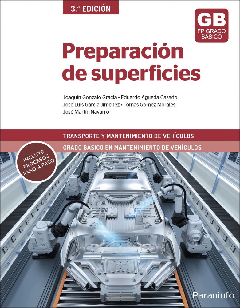 La preparación de superficies es la clave para lograr un excelente acabado en el pintado de un vehículo. Este libro desarrolla los contenidos del módulo profesional de Preparación de Superficies, del Ciclo Formativo de Grado Básico en Mantenimiento de Vehículos, perteneciente a la familia profesional de Transporte y Mantenimiento de Vehículos. Esta nueva edición de Preparación de superficies destaca por desarrollar los siguientes temas:  Necesidad de los equipos de protección.  Pictogramas en el etiquetado CLP.  Nuevas fichas técnicas.  Masillas UV.  Aparejos de secado ultravioleta.  Pulido de faros.  Material fotográfico actualizado que ilustra los aspectos teóricos.  Procesos paso a paso de diferentes labores de taller relacionadas con la materia. El contenido se estructura en 7 unidades, desarrolladas a partir de la información aportada por las empresas más importantes del sector, que permitirán una mejor comprensión de las diferentes técnicas de reparación. En ellas se desarrollan secuencialmente todos los contenidos, que permitirán al alumnado realizar operaciones simples para la preparación de las superficies del vehículo, asegurando la calidad requerida, en los tiempos y las formas fijados, y mediante la aplicación de los procedimientos especificados por cada fabricante en las condiciones de seguridad establecidas. Los autores, profesores de Formación Profesional, poseen una amplia experiencia en la docencia y la investigación, y participan de manera activa en encuentros y eventos relacionados con el sector del automóvil. Además, son autores de otras obras de formación publicadas por esta editorial.