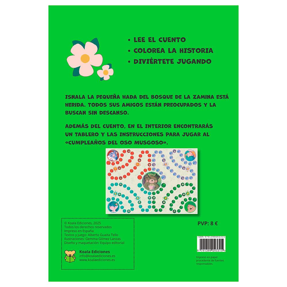 Isnala, la pequeña hada del bosque de la Zamina, está herida. Mientras, todos sus amigos están preocupados y la buscan sin descanso. Libro que combina un cuento que se puede colorear y un juego de mesa llamado %u201CEl cumpleaños del oso musgoso%u201D en la solapa desplegable trasera del cuento.