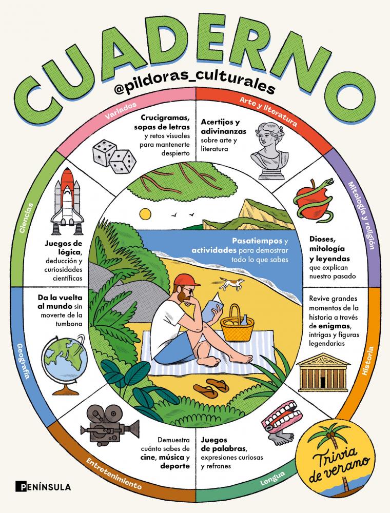 UN CUADERNO DE ACTIVIDADES PARA DISFRUTAR EN LA PLAYA O LA PISCINA ¿Crees que podrías relacionar grandes frases del cine con las películas que las hicieron inmortales? ¿Sabes qué país tiene un dragón en su bandera? ¿Conoces el origen de algunas de las expresiones que usamos cada día? Crucigramas culturales Sopas de letras temáticas Enigmas lógicos Trivia Ejercicios de deducción Organizados por categorías al más puro estilo trivia ?Ciencias, Arte y literatura, Historia, Lengua, Geografía, Cine y Deportes??, este cuaderno propone retos tan variados como reconstruir diálogos míticos del cine, descubrir intrusos en listas de los premios Óscar, seguir itinerarios interactivos por las siete maravillas del mundo antiguo, detectar gazapos en expresiones cotidianas o resolver laberintos, crucigramas y sopas de letras. Una invitación a desconectar de la pantalla y recuperar el placer de pensar, lápiz en mano.