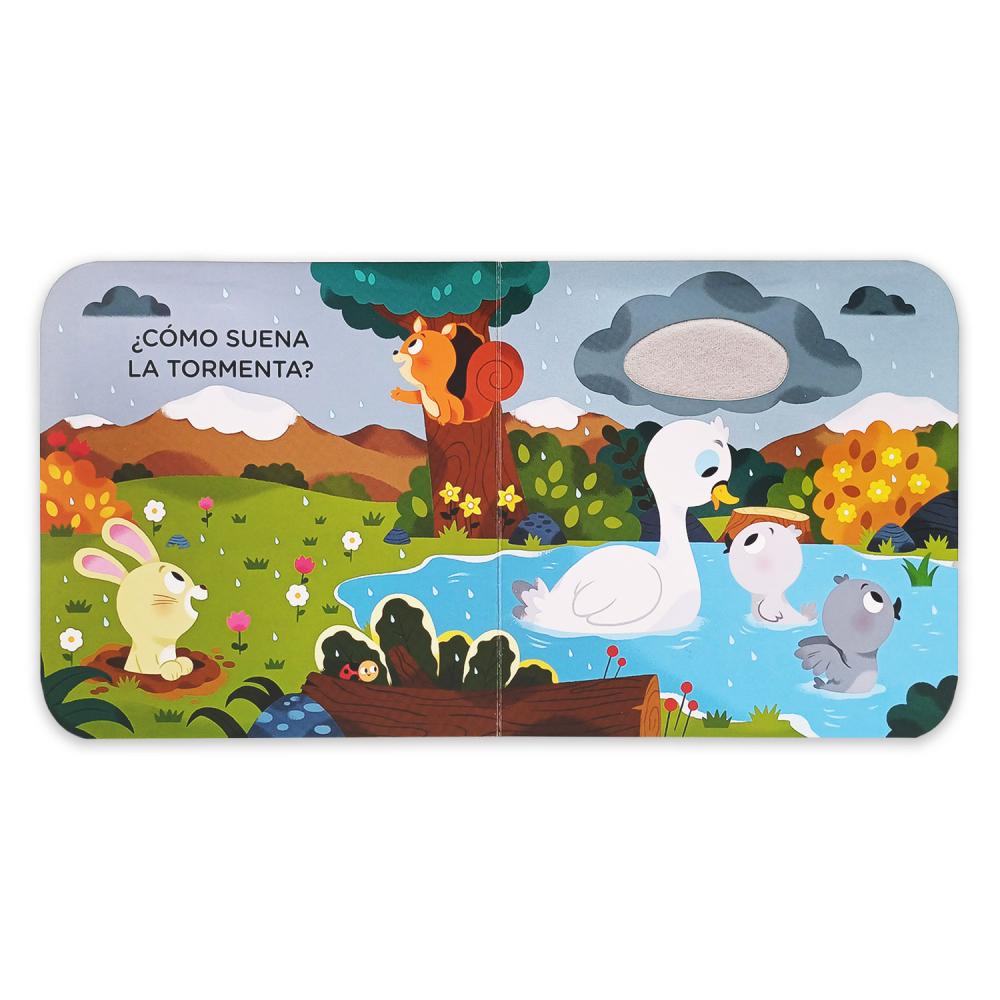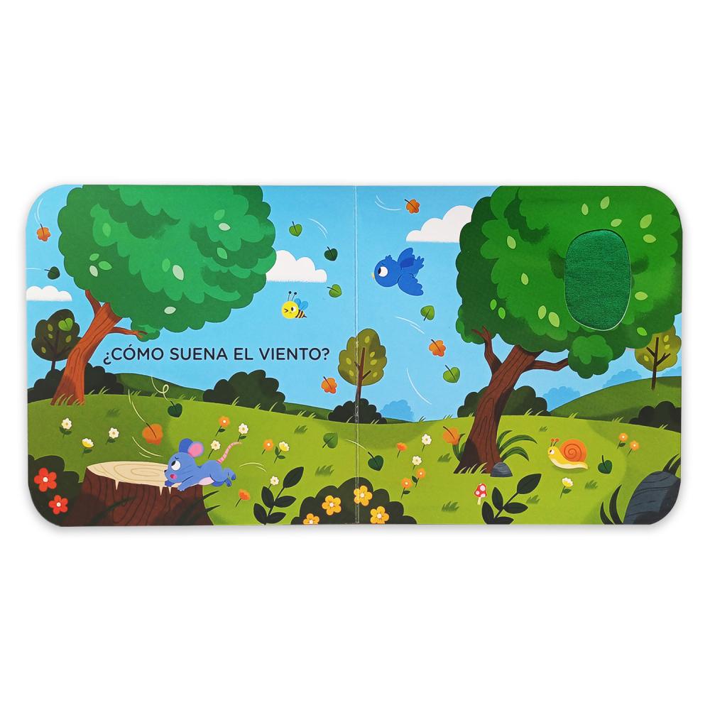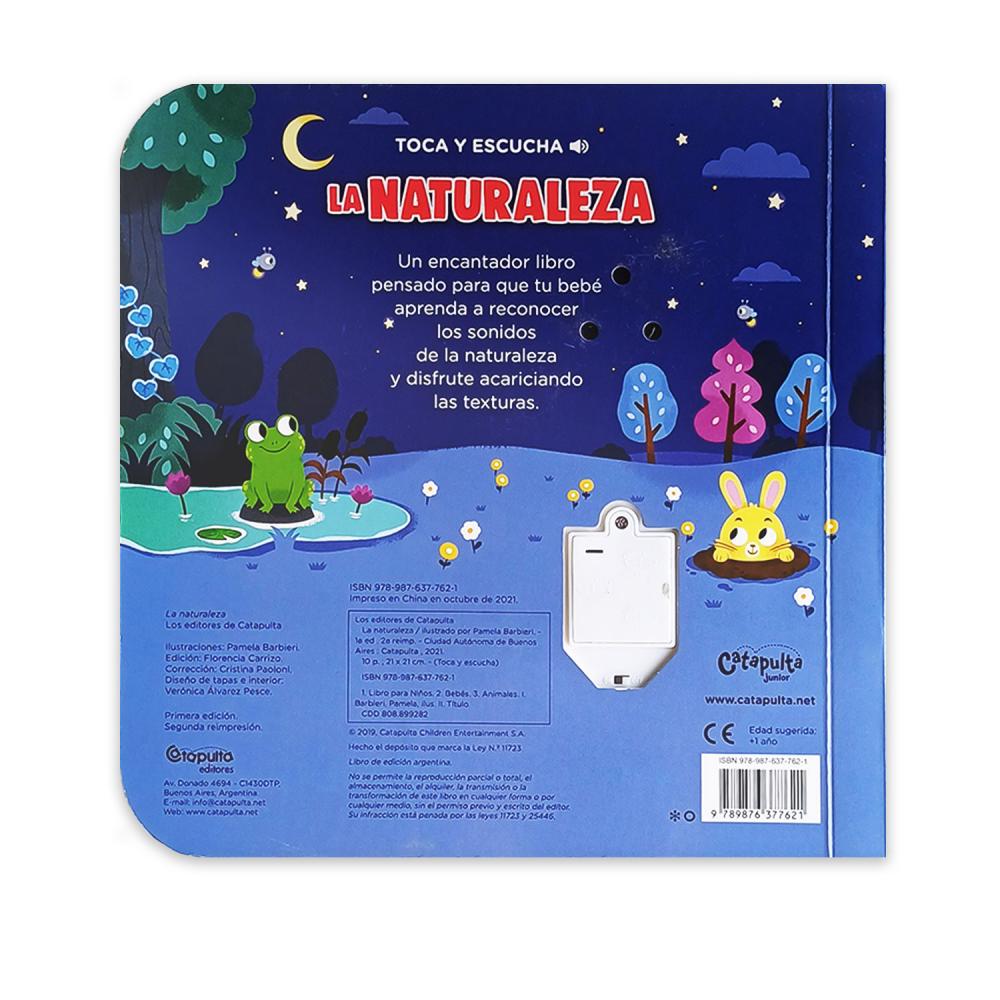 Libros sonoros Este nuevo título de la colección Toca y escucha presenta los sonidos de la naturaleza. ¿Cuáles son los sonidos de la noche? ¿Cómo es el ruido del mar? ¿Cómo se escucha el susurro del viento? El bebé va a reconocer estos sonidos y disfrutará acariciando las texturas de sus páginas. ? Cada sonido se escucha al tocar la parte texturada de la página. ? Libro con interruptor de sonido.
