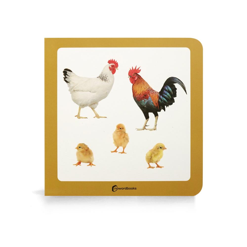 Un gallo, una gallina, un huevo, y oh!, el huevo se rompe y aparece un pollito!. Secuencia que se repetirá tres veces hasta tener a nuestra familia con el Gallo, la Gallina y 3 Pollitos.