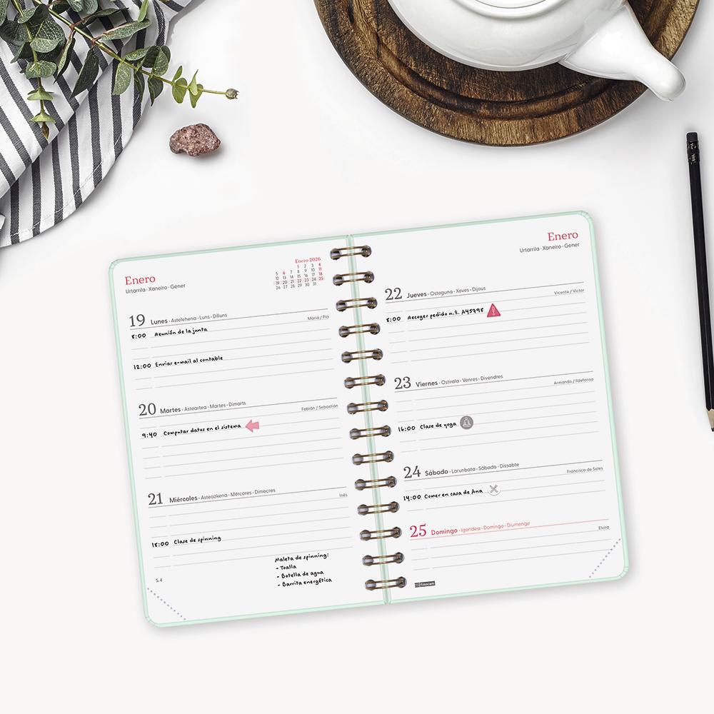 Agenda espiral Alma E5 menta 2026 semana vista horizontal