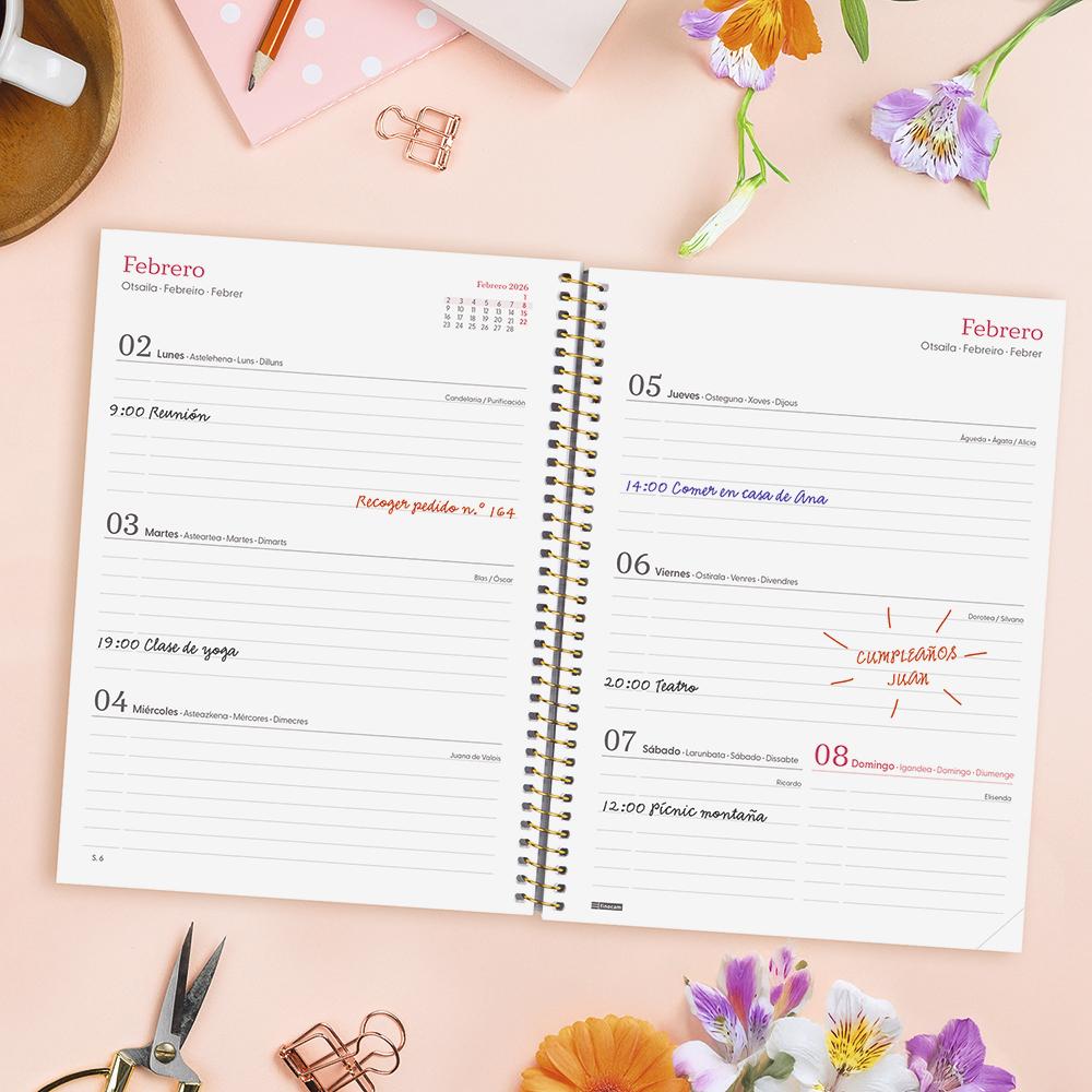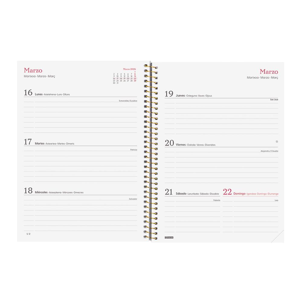 Dispone de encuadernación en espiral con tapas ligeras de polipropileno, esquinas microperforadas y goma elástica. Contiene información relativa a onomástica, festivos nacionales y cambios de estación entre otros.Incluye apartados extra para datos personales, horarios, plan anual y apartados para anotaciones entre otros.De enero 2026 a diciembre 2026.Dimensiones exteriores: 16,2 x 1,4 x 21,2cm.Dimensiones del papel: 15,5 x 21,2cm.