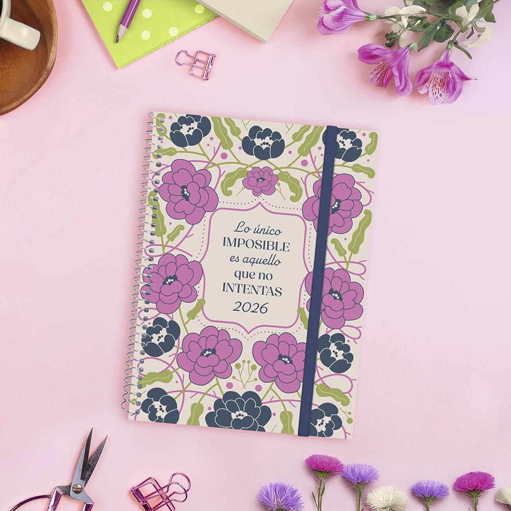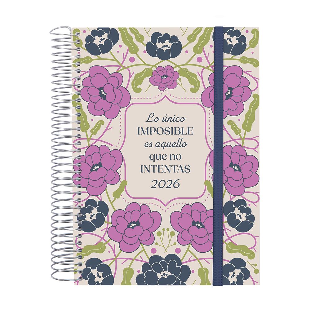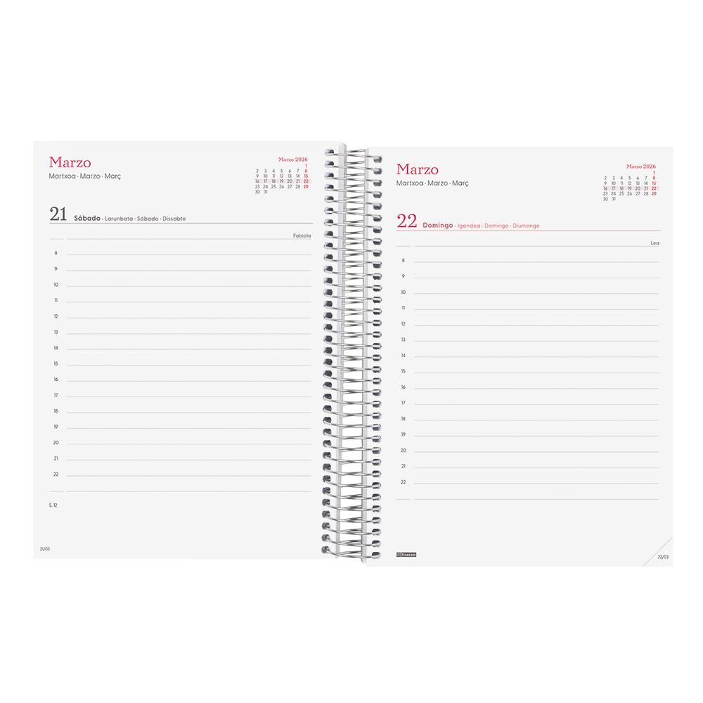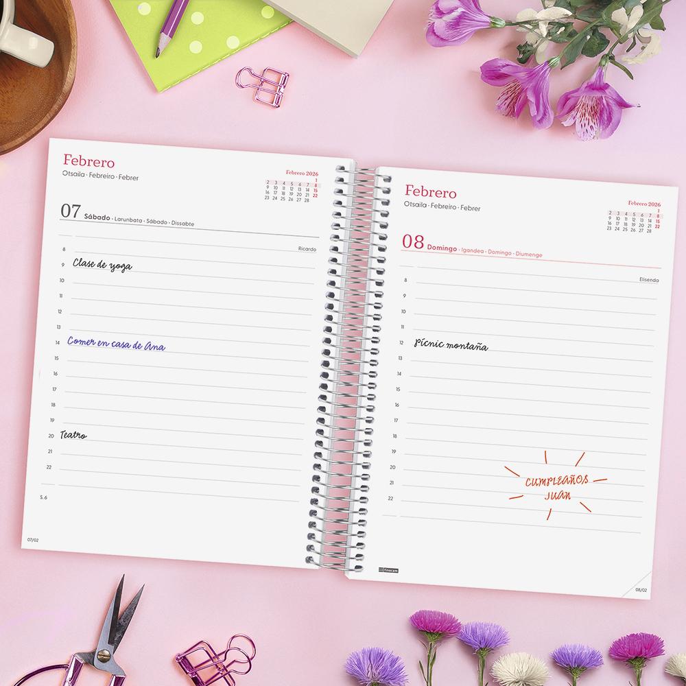 Dispone de encuadernación en espiral con tapas ligeras de polipropileno, esquinas microperforadas y goma elástica. Contiene información relativa a onomástica, festivos nacionales y cambios de estación entre otros.Incluye apartados extra para datos personales, horarios, plan anual y apartados para anotaciones entre otros.De enero 2026 a diciembre 2026.Dimensiones exteriores: 17,2 x 2,9 x 21,2cm.Dimensiones del papel: 15,5 x 21,2cm.