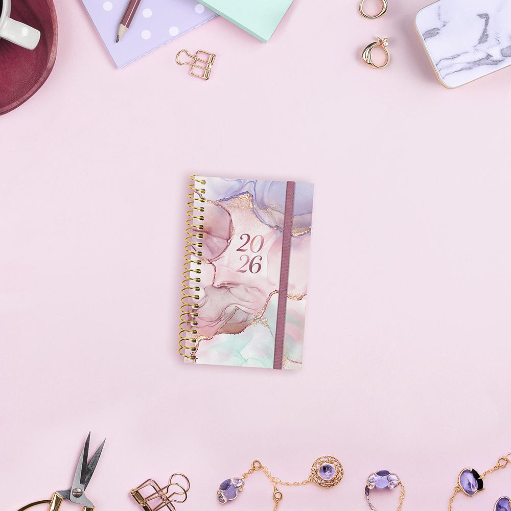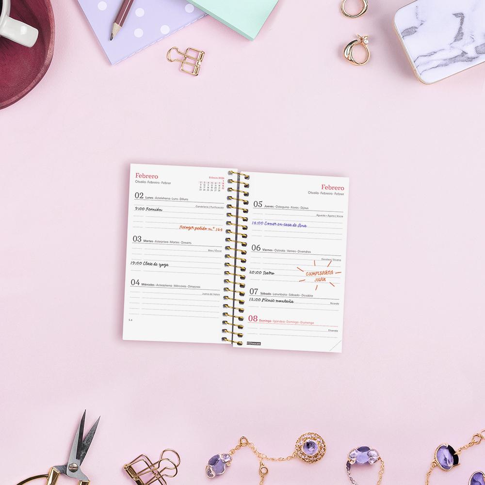 Dispone de encuadernación en espiral con tapas ligeras de polipropileno, esquinas microperforadas y goma elástica. Contiene información relativa a onomástica, festivos nacionales y cambios de estación entre otros.Incluye apartados extra para datos personales, horarios, plan anual y apartados para anotaciones entre otros.De enero 2026 a diciembre 2026.Dimensiones exteriores: 8,5 x 1,4 x 12,7cm.Dimensiones del papel: 7,9 x 12,7cm.