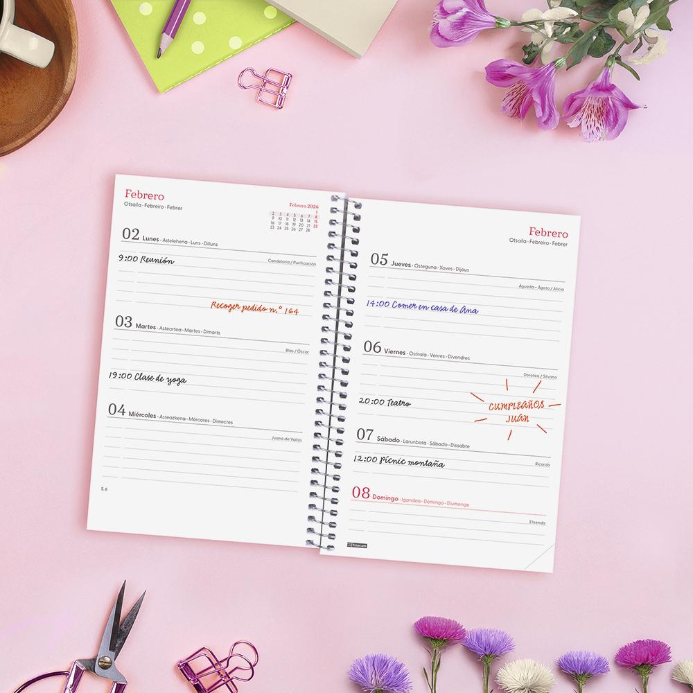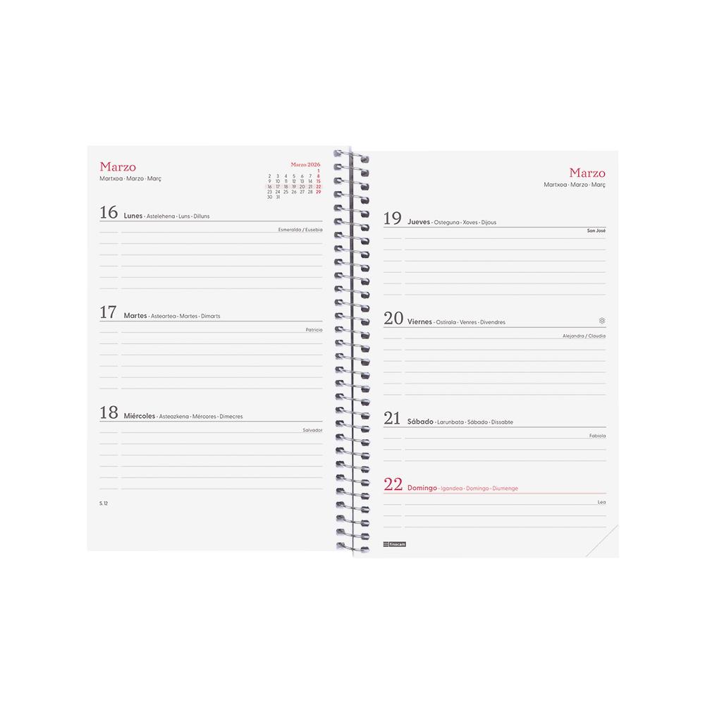 Dispone de encuadernación en espiral con tapas ligeras de polipropileno, esquinas microperforadas y goma elástica. Contiene información relativa a onomástica, festivos nacionales y cambios de estación entre otros.