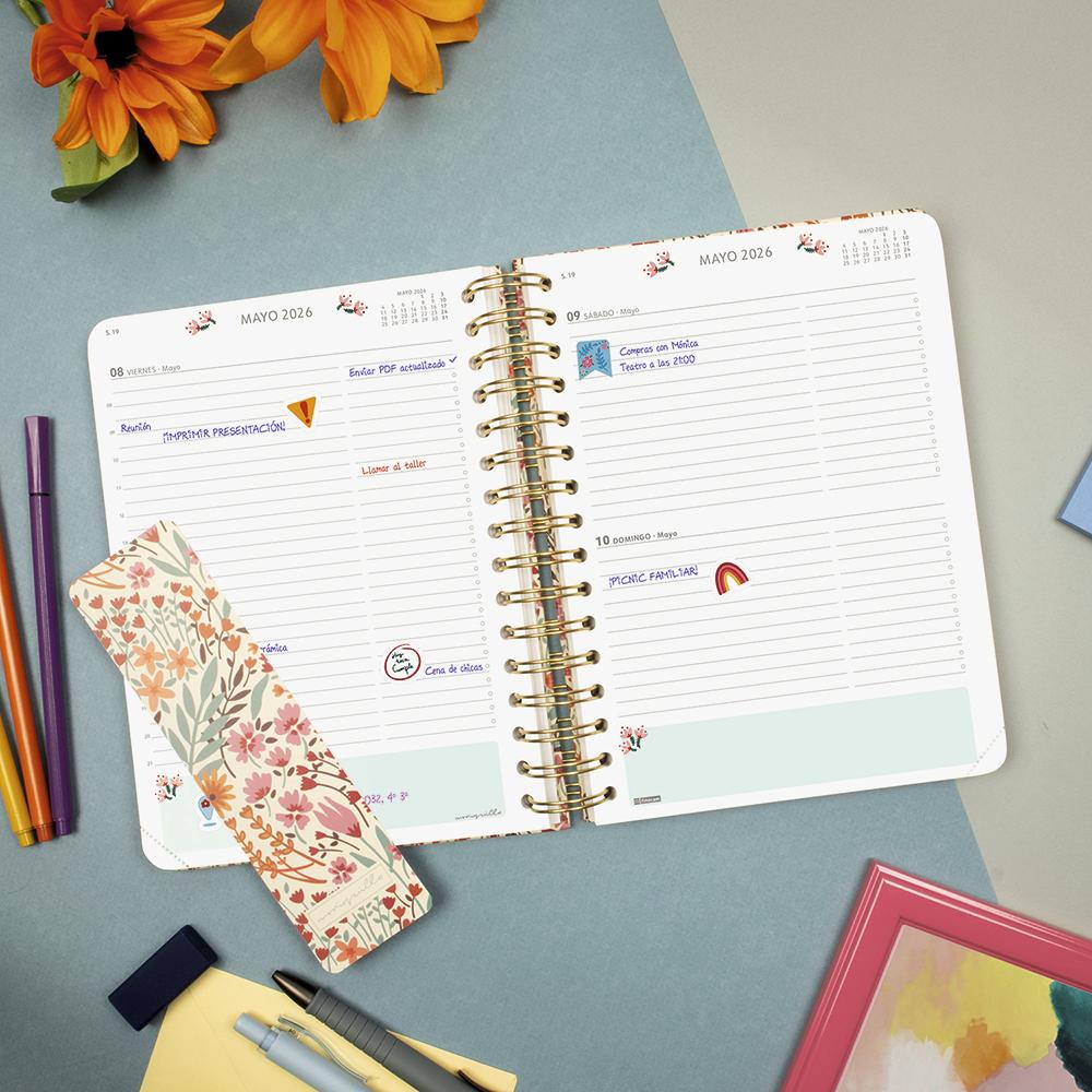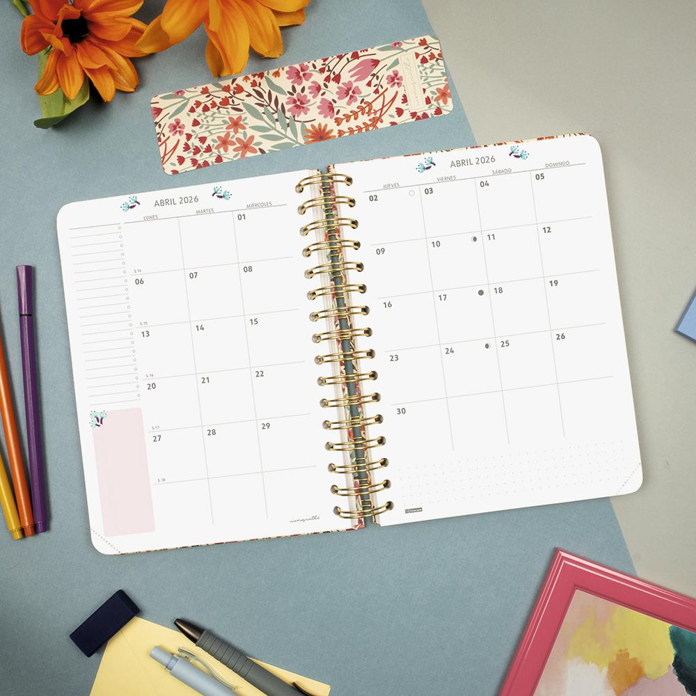 Dispone de encuadernación en espiral con tapa dura de cartón mate antirrayaduras, esquinas microperforadas y goma elástica. Contiene información relativa a: onomástica, festivos nacionales y cambios de estación entre otros.Incluye apartados extra para datos personales, horarios, planificación mensual, apartados para anotaciones y set de adhesivos temáticos entre otros. También incluye dos marcapáginas.De enero 2026 a diciembre 2026.Dimensiones exteriores: 17,3 x 2,2 x 22cm.Dimensiones del papel: 15,5 x 21,2cm.