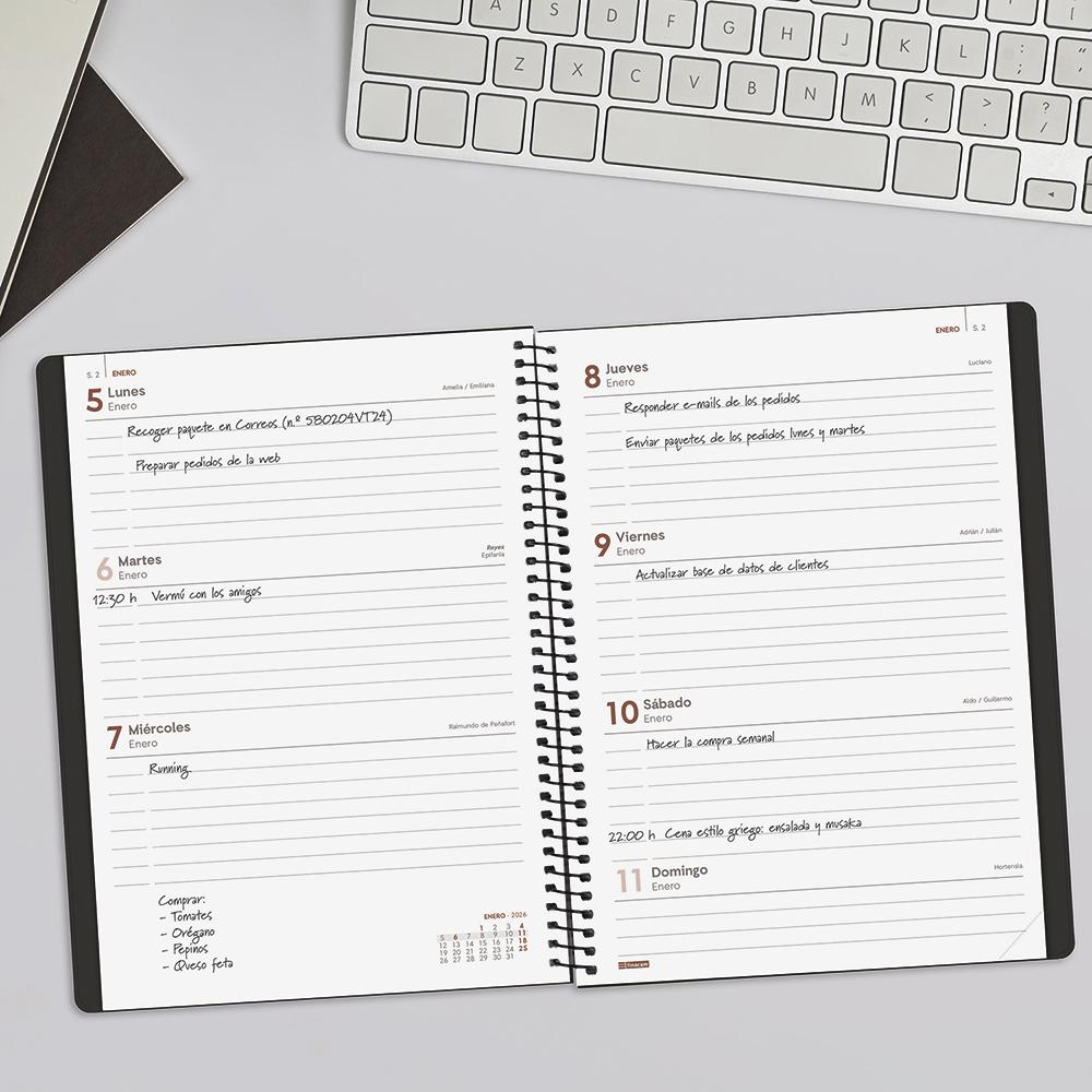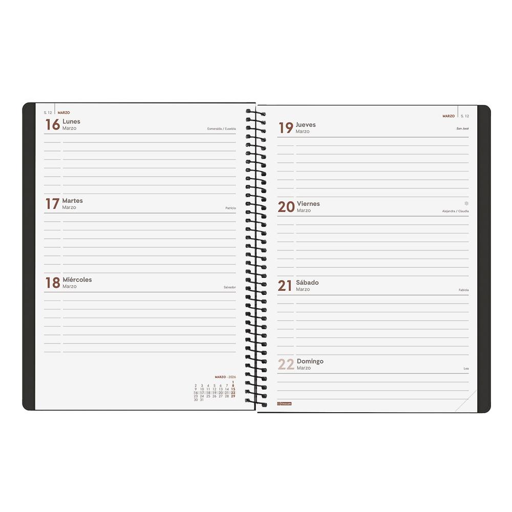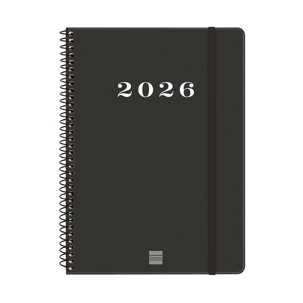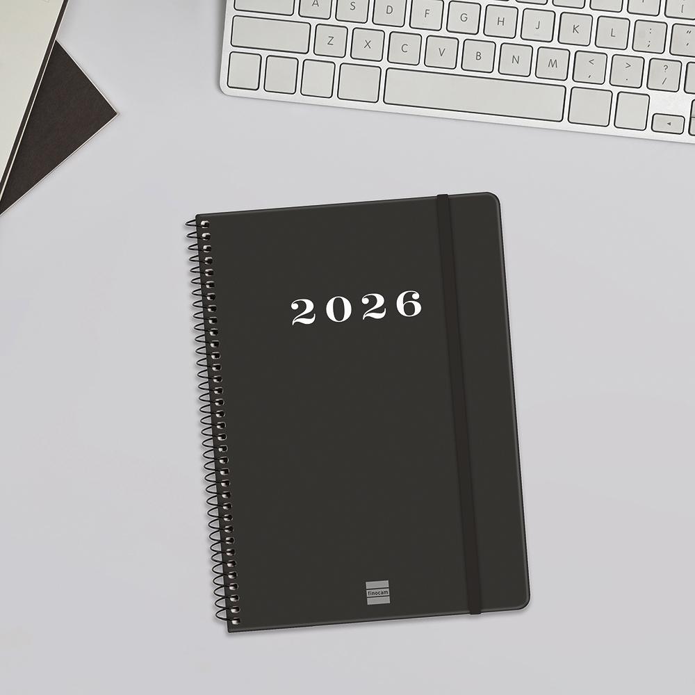 Dispone de encuadernación en espiral con tapas de polipropileno, goma elástica y esquinas microperforadas. Contiene información relativa a: onomástica, festivos nacionales y cambios de estación entre otros. Incluye apartados extra para datos personales, horarios, planificación anual, usos del teclado y hojas para anotaciones entre otros.De enero 2026 a diciembre 2026.Dimensiones exteriores: 17,5 x 2,9 x 21,2cm.Dimensiones del papel: 15,5 x 21,2cm.