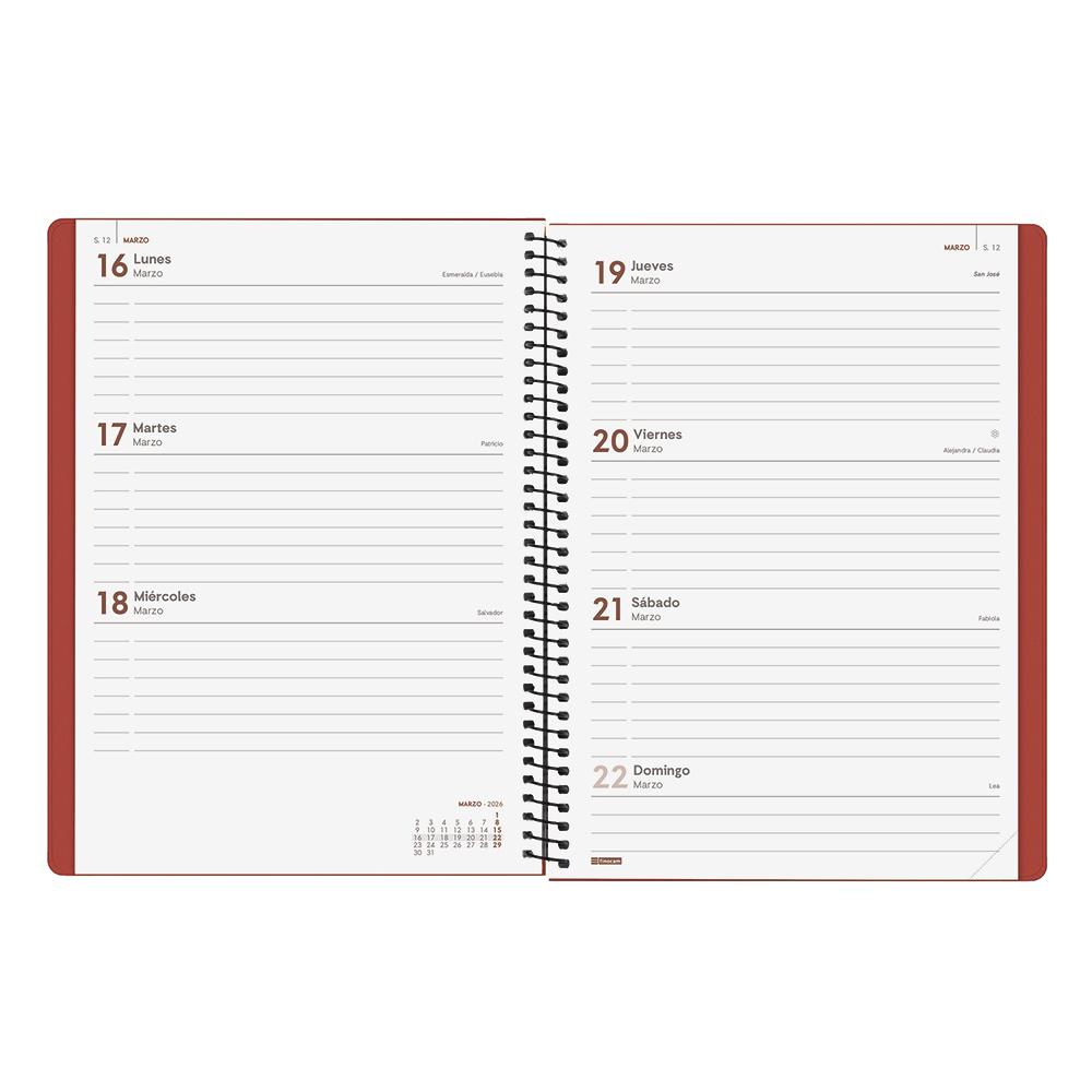 Dispone de encuadernación en espiral con tapas de polipropileno, goma elástica y esquinas microperforadas. Contiene información relativa a: onomástica, festivos nacionales y cambios de estación entre otros.