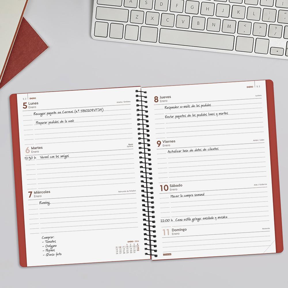 Organiza tus tareas de la forma más eficaz con la ayuda de esta fantástica agenda en formato semana vista, ¡te encantará su elegante tono rojo!