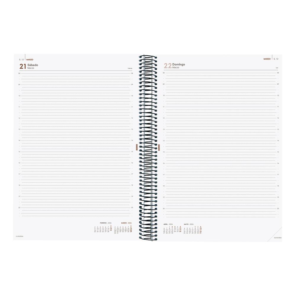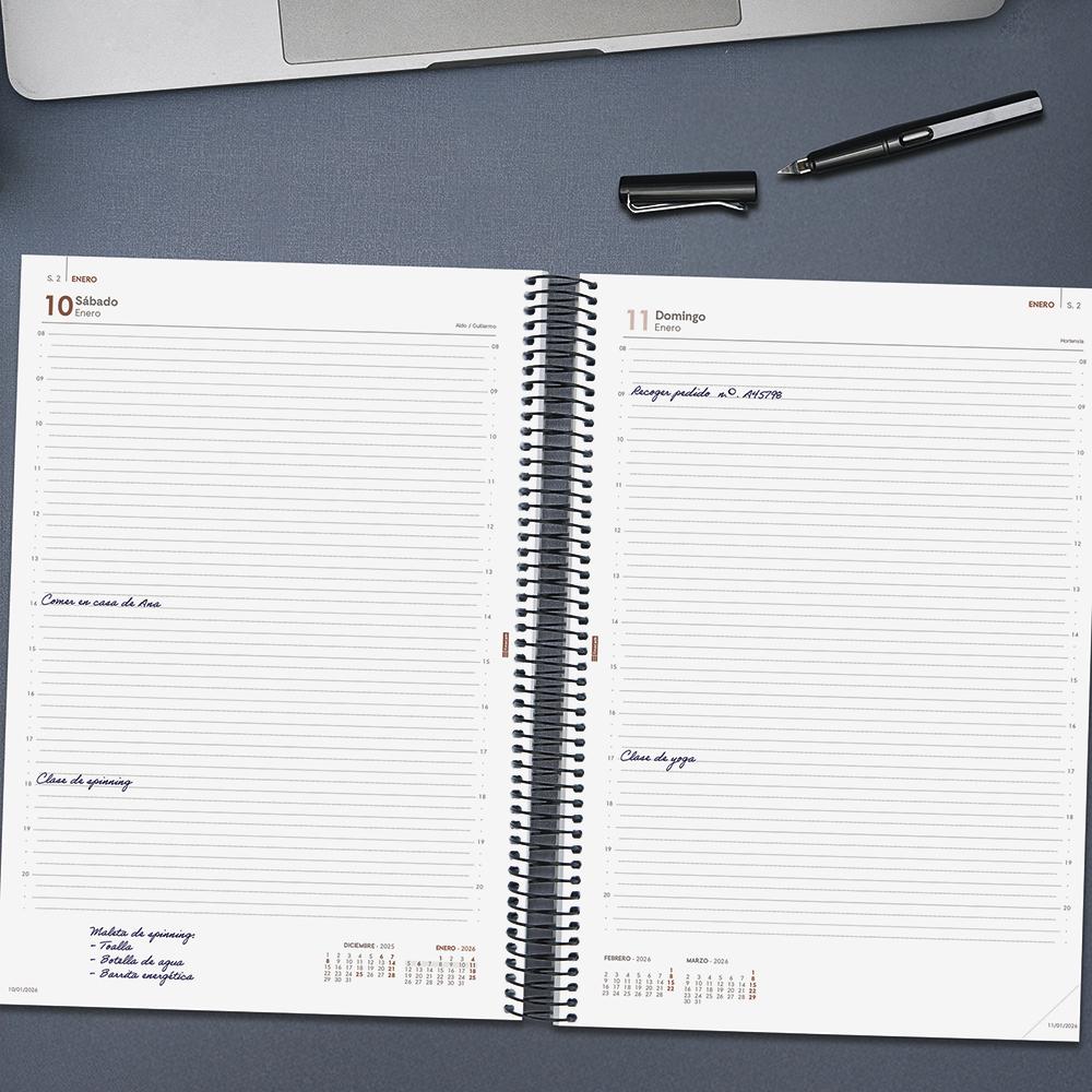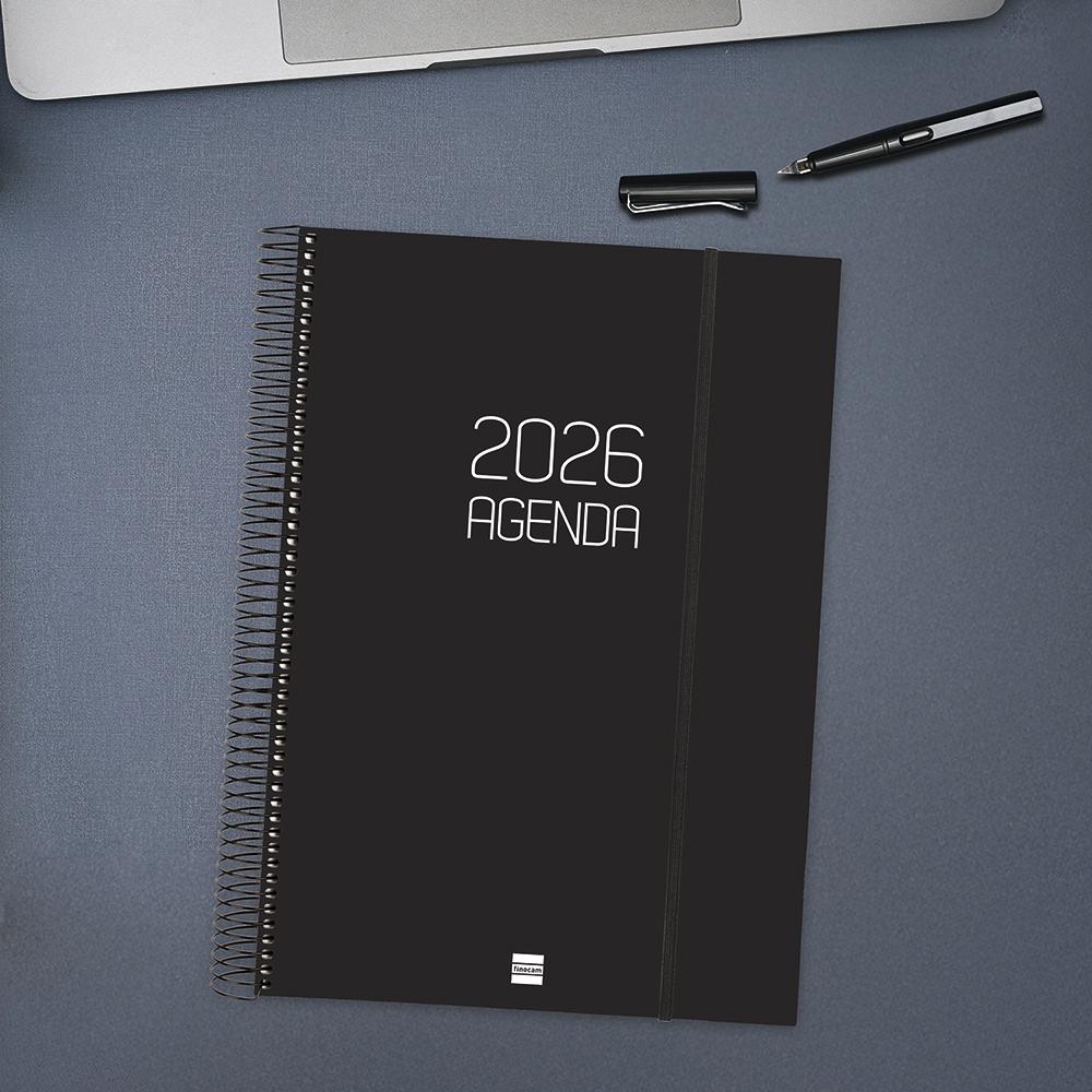 Dispone de encuadernación en espiral con tapas de polipropileno, goma elástica y esquinas microperforadas. Contiene información relativa a: onomástica, festivos nacionales y cambios de estación entre otros. Incluye apartados extra para datos personales, horarios, planificación anual, usos del teclado y hojas para anotaciones entre otros.De enero 2026 a diciembre 2026.Dimensiones: 17,5 x 2,9 x 21,2cm.