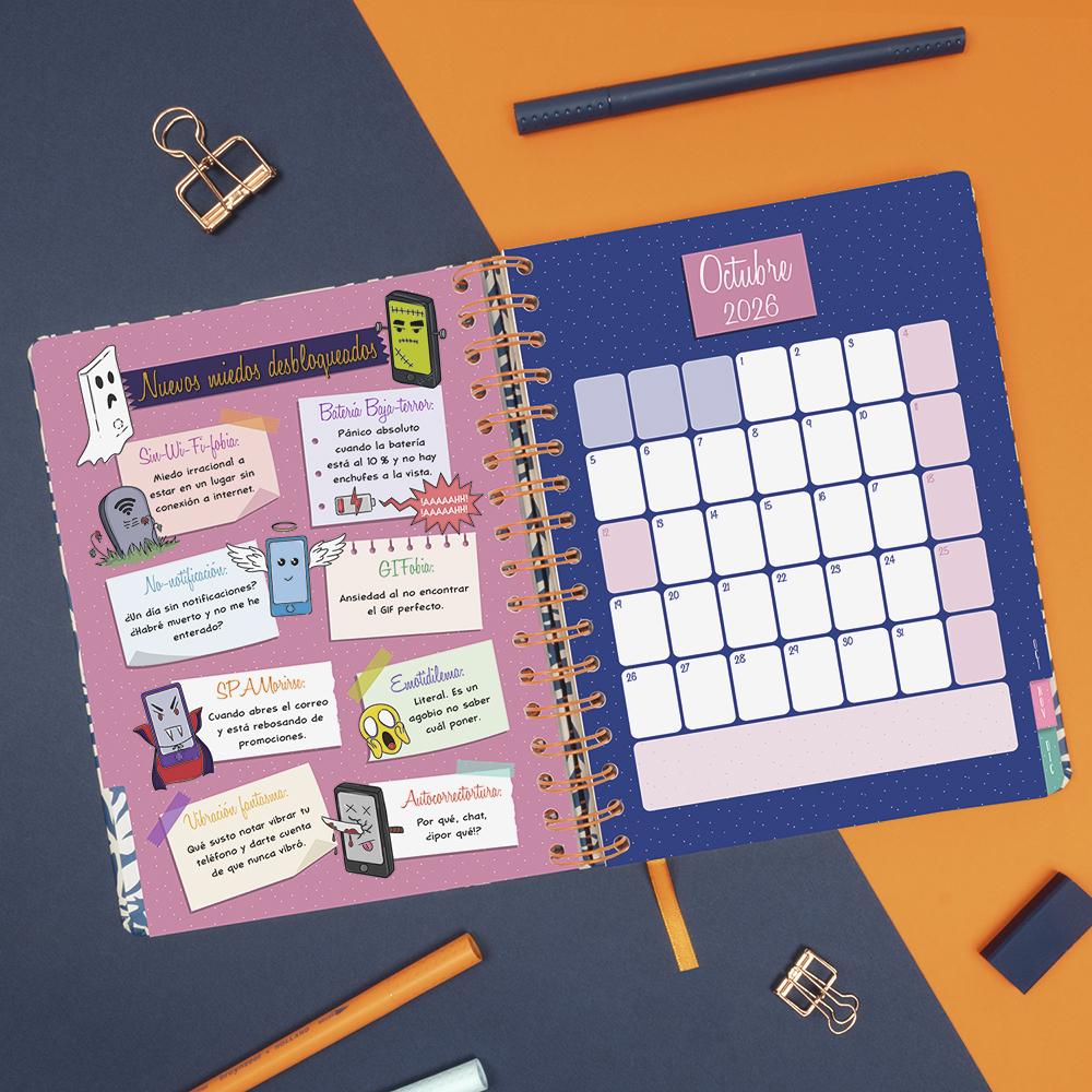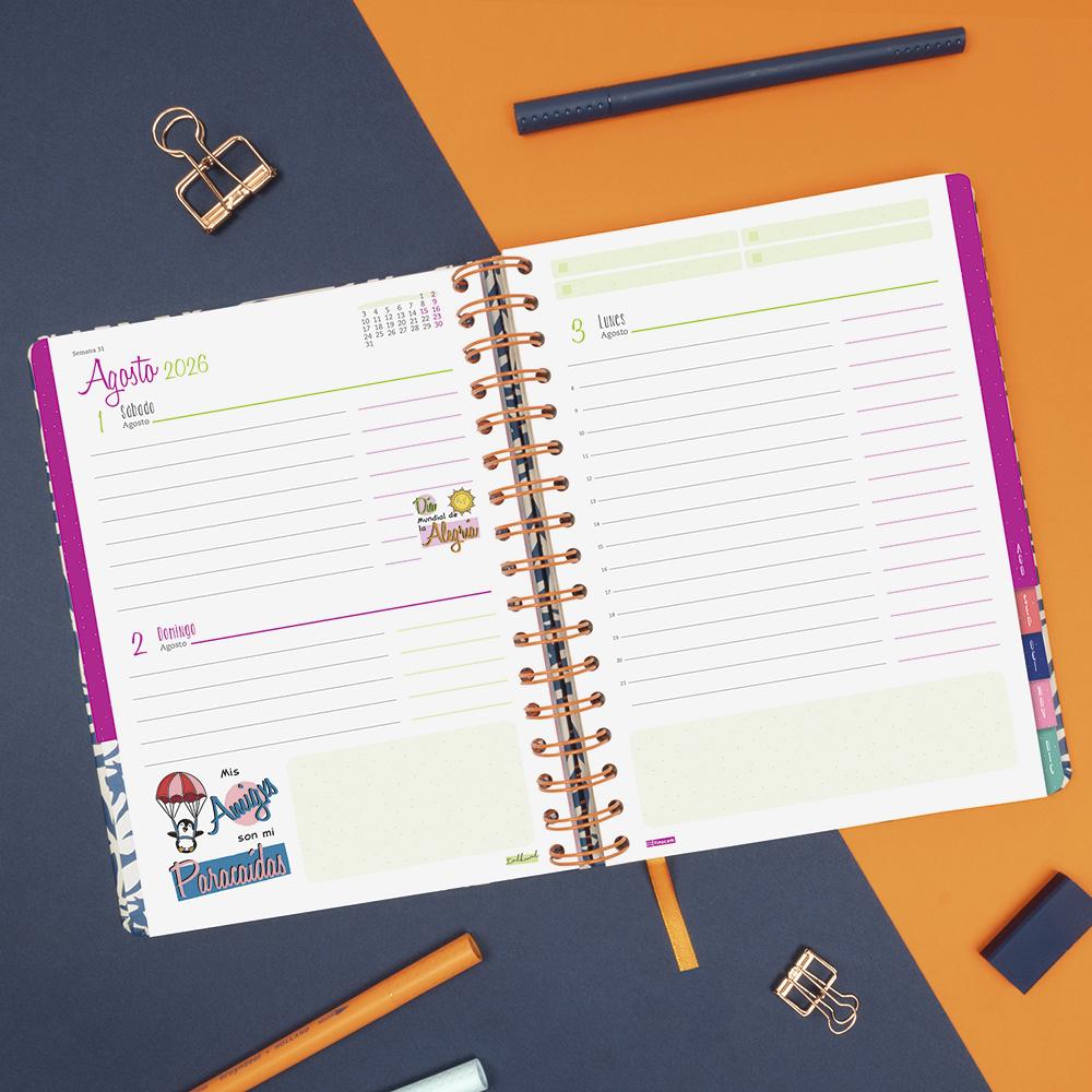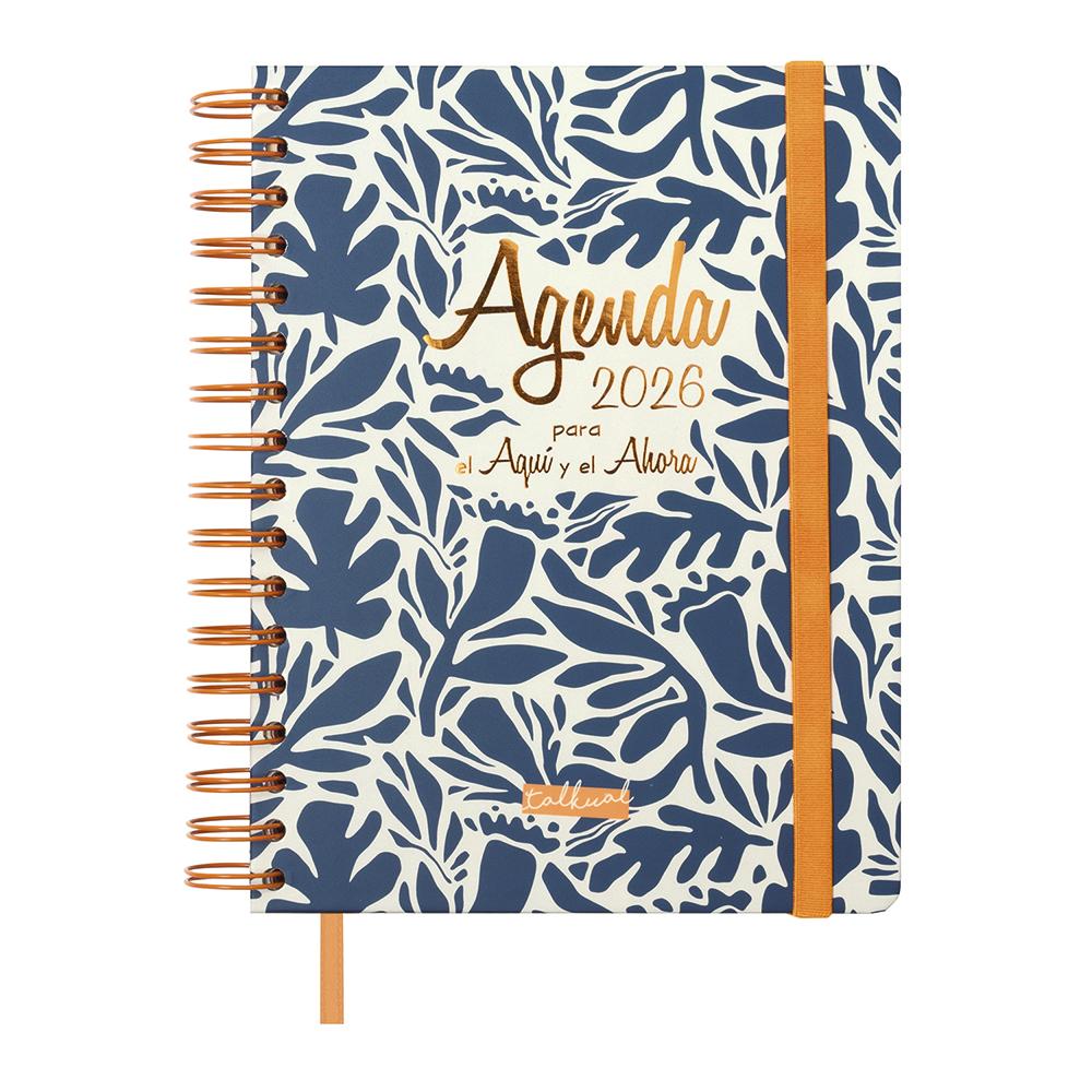 Dispone de encuadernación en espiral doble con tapa dura, goma elástica, cinta marcadora y pestañas mensuales troqueladas. Contiene información relativa a festivos, cambios de estación, días especiales y una frase Talkual para cada semana.Incluye apartados extra para datos personales, horarios, apartados para anotaciones, adhesivos, set de notas engomadas y funda transparente entre otros.De enero 2026 a diciembre 2026.Dimensiones exteriores: 19,3 x 3,5 x 22cm.Dimensiones del papel: 15,5 x 21,7cm.