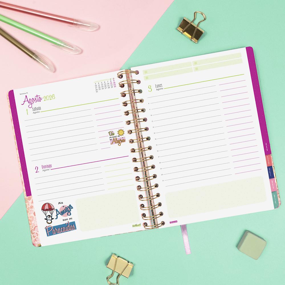 Organiza tus tareas de la forma más inspiradora con la ayuda de esta fantástica agenda en formato día por página, ¡te encantará su colorido diseño animal print con detalles dorados!