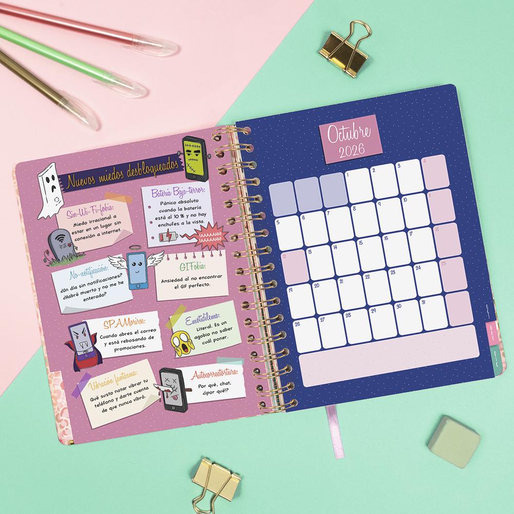 Incluye apartados extra para datos personales, horarios, apartados para anotaciones, adhesivos, set de notas engomadas y funda transparente entre otros.