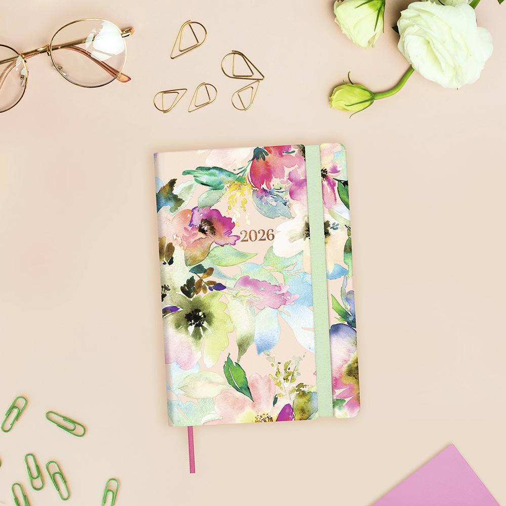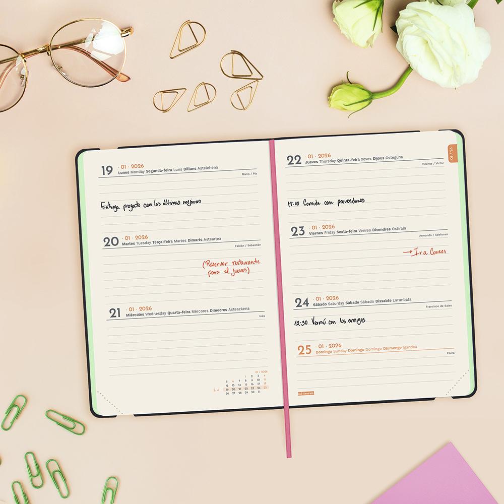 Dispone de encuadernación encolada con tapa blanda suave, esquinas microperforadas, goma elástica y cinta marcadora. Contiene información relativa a: onomástica y festivos nacionales.Incluye apartados extra para datos personales, horarios, planificación mensual y apartados para anotaciones entre otros.De enero 2026 a diciembre 2026.Dimensiones exteriores: 12 x 1,3 x 17,2cm.Dimensiones del papel: 11,8 x 16,8cm.