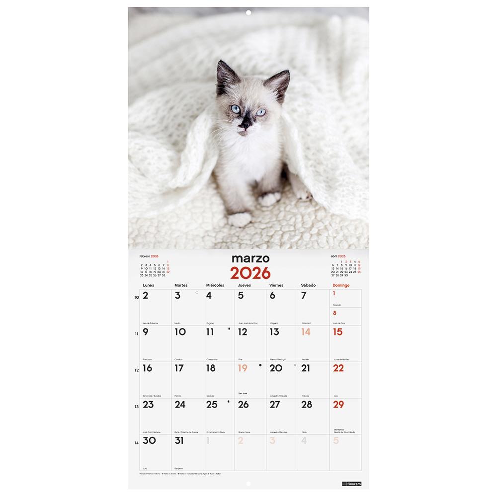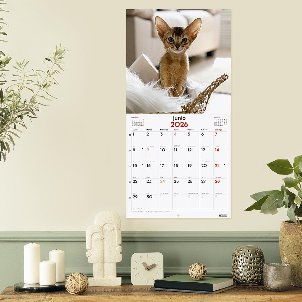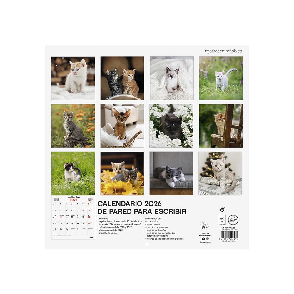 Calendario anual de pared con agujero en la parte superior para colgar, ¡perfecto para planificar! En este calendario encontrarás las imágenes de gatitos más tiernas para dibujarte una sonrisa cada vez que lo consultes.Dimensiones del calendario colgado: 30 x 60cm.Dimensiones del calendario cerrado: 30 x 30cm.Formato mes vista, anual de Enero de 2026 a Diciembre 2026 (12 meses).