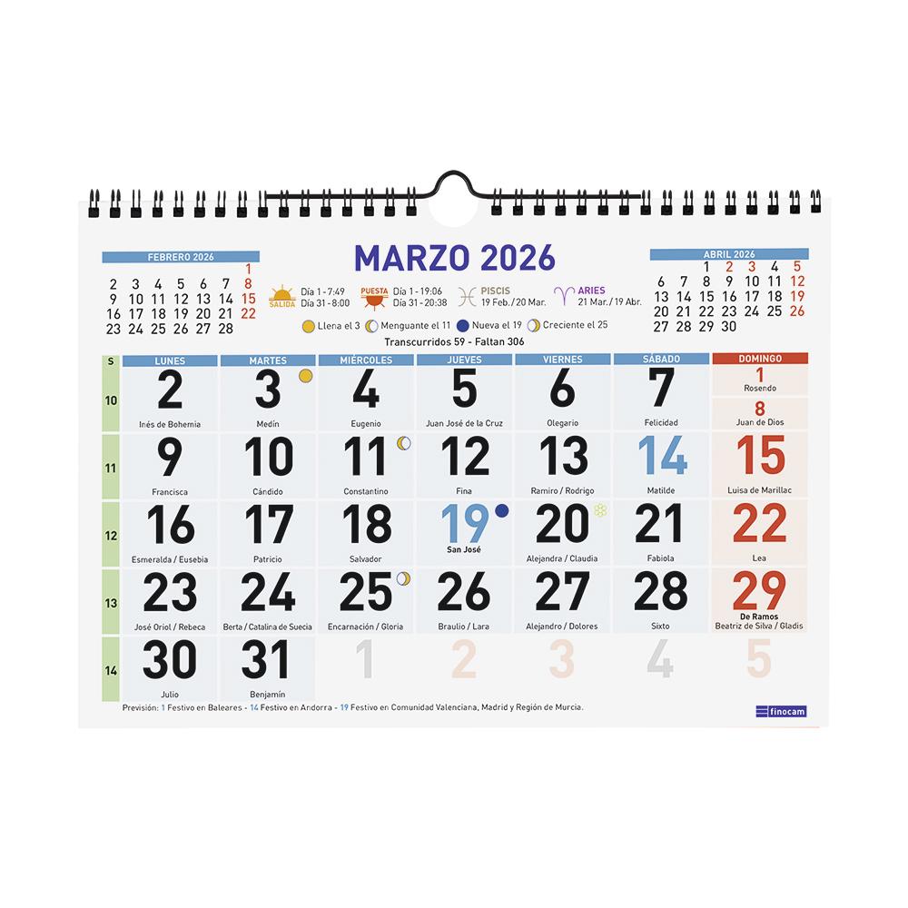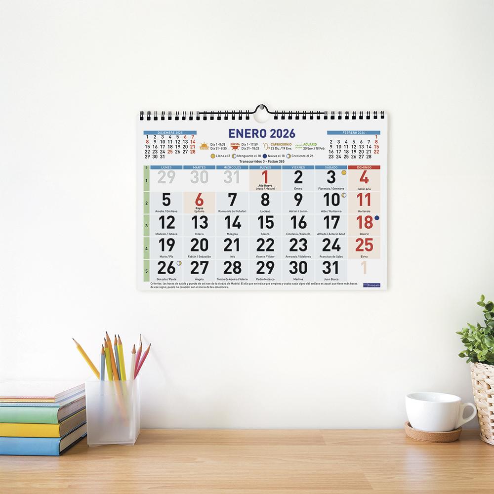 Interior diseño mes vista, para planificar mensualmente. La anualidad del calendario incluye la información relativa a: onomástica, festivos nacionales, festivos de las CC. AA., días señalados, fases lunares y cambios de estación.Material: Papel y doble espiral metálica. 120 g/m².Tamaño del papel: 30 x 21cm.