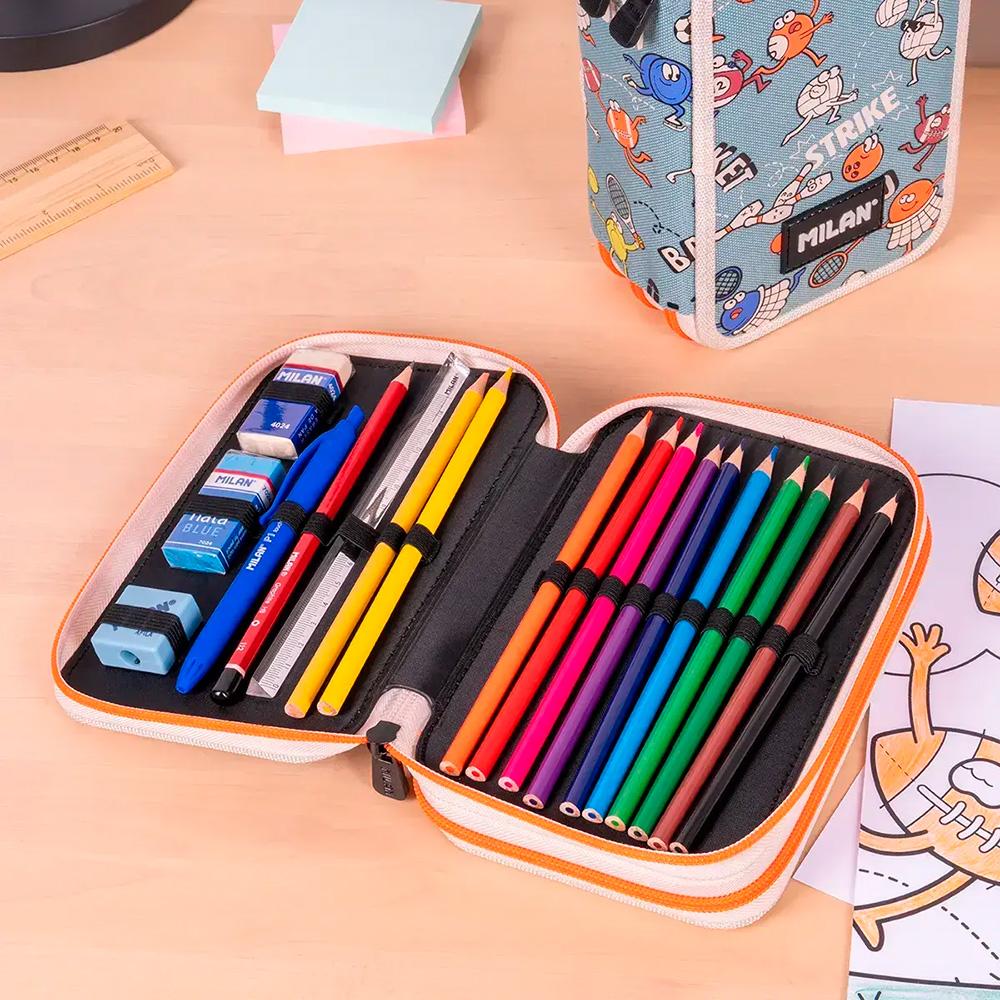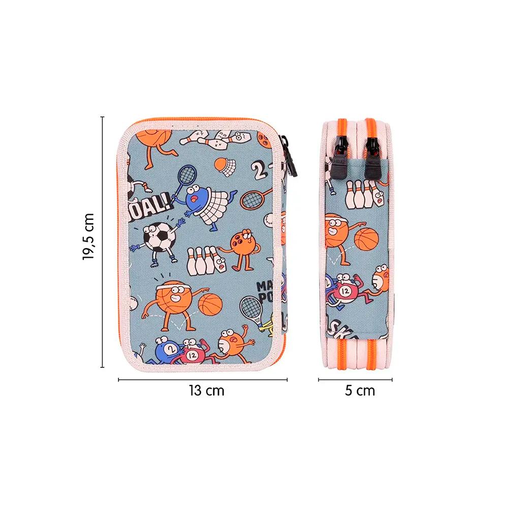 Estuche de dos pisos modelo Sports.Dispone de dos pisos que permiten mantener el material escolar siempre ordenado y accesible. Contiene una amplia variedad de material escolar de alta calidad.Incluye 2 gomas de borrar, 1 sacapuntas, 1 lápiz de grafito HB, 1 bolígrafo con tinta azul, 1 regla de 15cm, 12 lápices de colores triangulares y 18 rotuladores de punta cónica.Dimensiones: 19,5 x 13 x 5cm.Cuidados: Lavar a mano máx. 30º, no usar lejía, no usar secadora y no planchar.