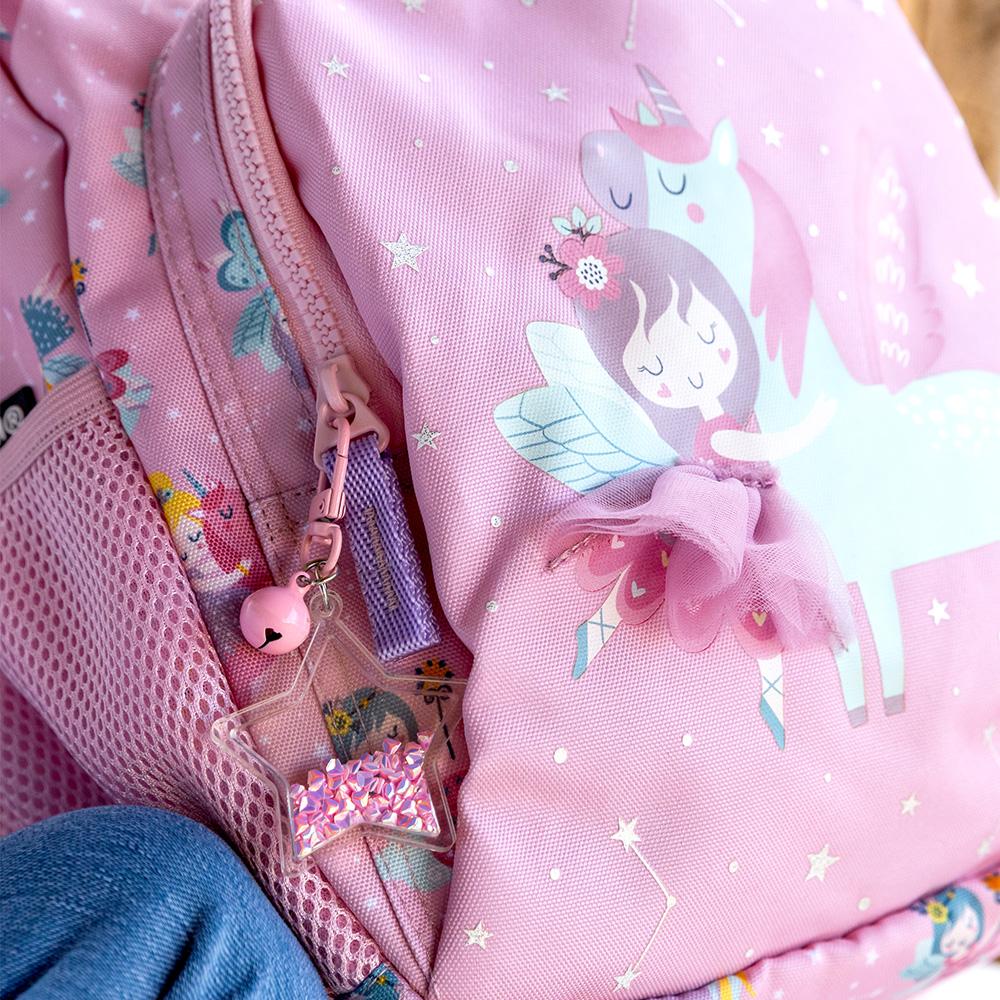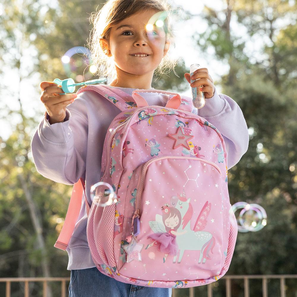 La mochila modelo London Fairies dispone de un compartimento de gran capacidad con apertura superior, y otro más pequeño con apertura frontal. Cuenta con espalda acolchada, cremalleras de nylon de alta calidad y muy resistentes, asas ergonómicas acolchadas y regulables con cierre de seguridad, asa superior reforzada, tarjeta de identificación y llavero de purpurina.Fabricada a partir de botellas de plástico recicladas.Dimensiones: 25,5 x 16 x 35cm.Capacidad 12 litros.