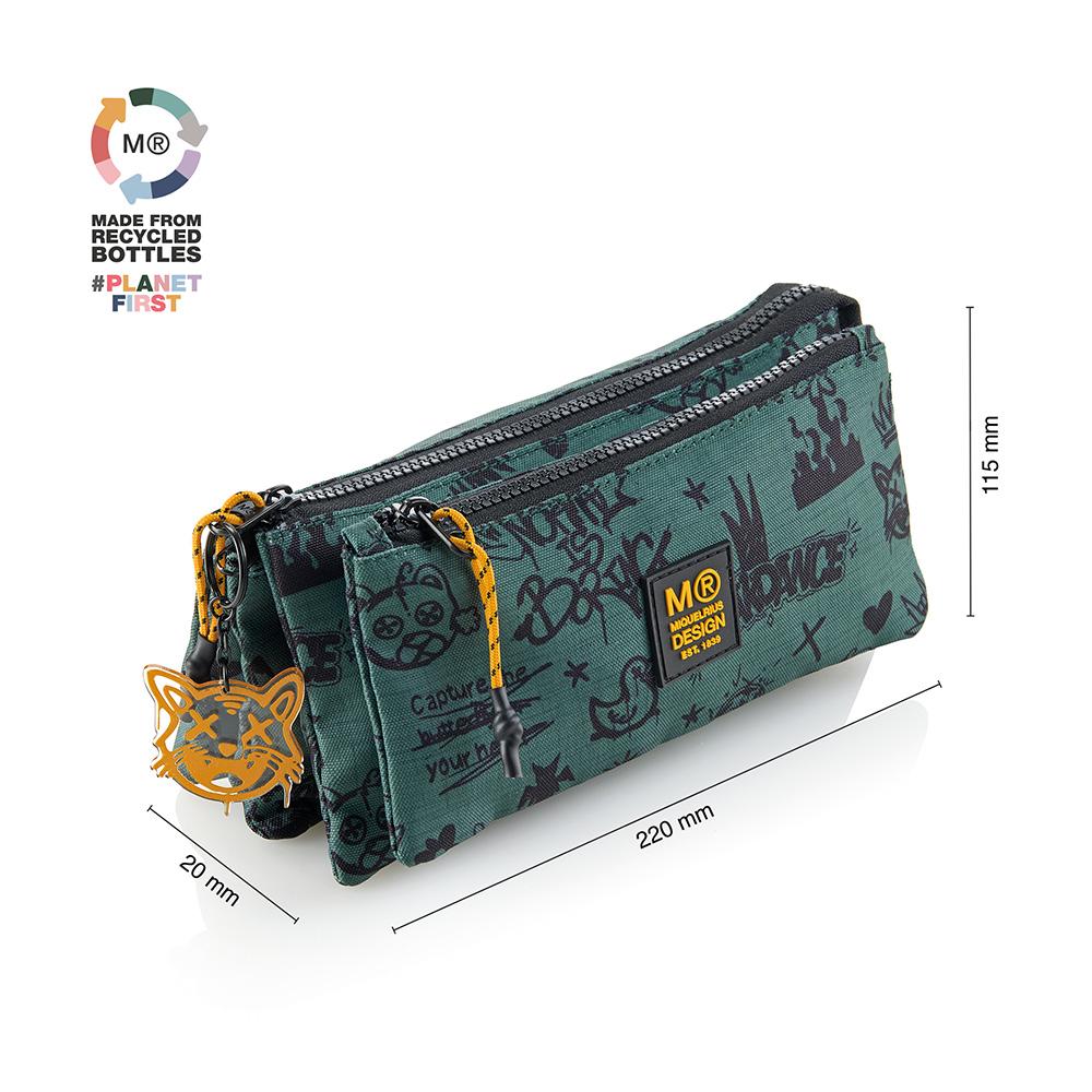 Este portatodo modelo Not Boring dispone de tres cremalleras y cuatro compartimentos que facilitan la organización de tu material de escritorio, y está fabricado en poliéster reciclado (RPET) y altamente resistente. Dispone de amplia capacidad, y su diseño permite que ocupe poco espacio.Medidas: 22 x 2 x 11,5cm.