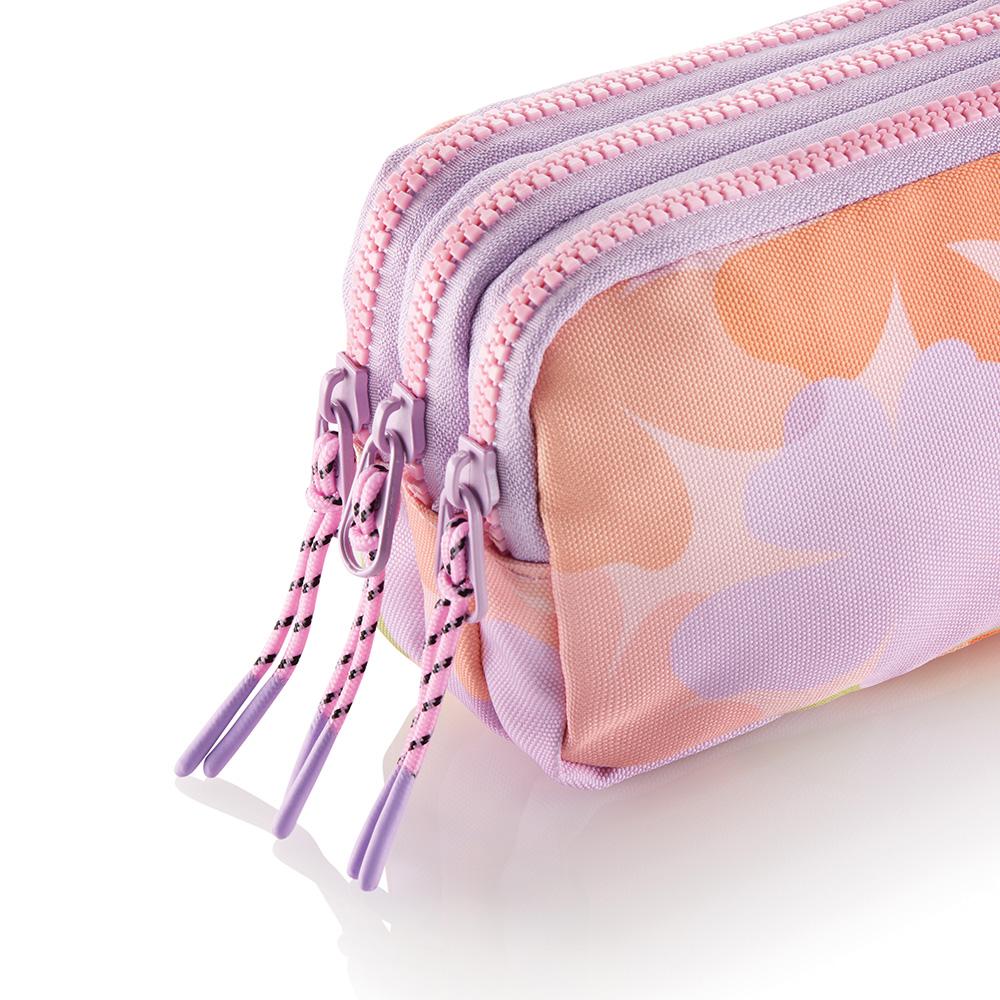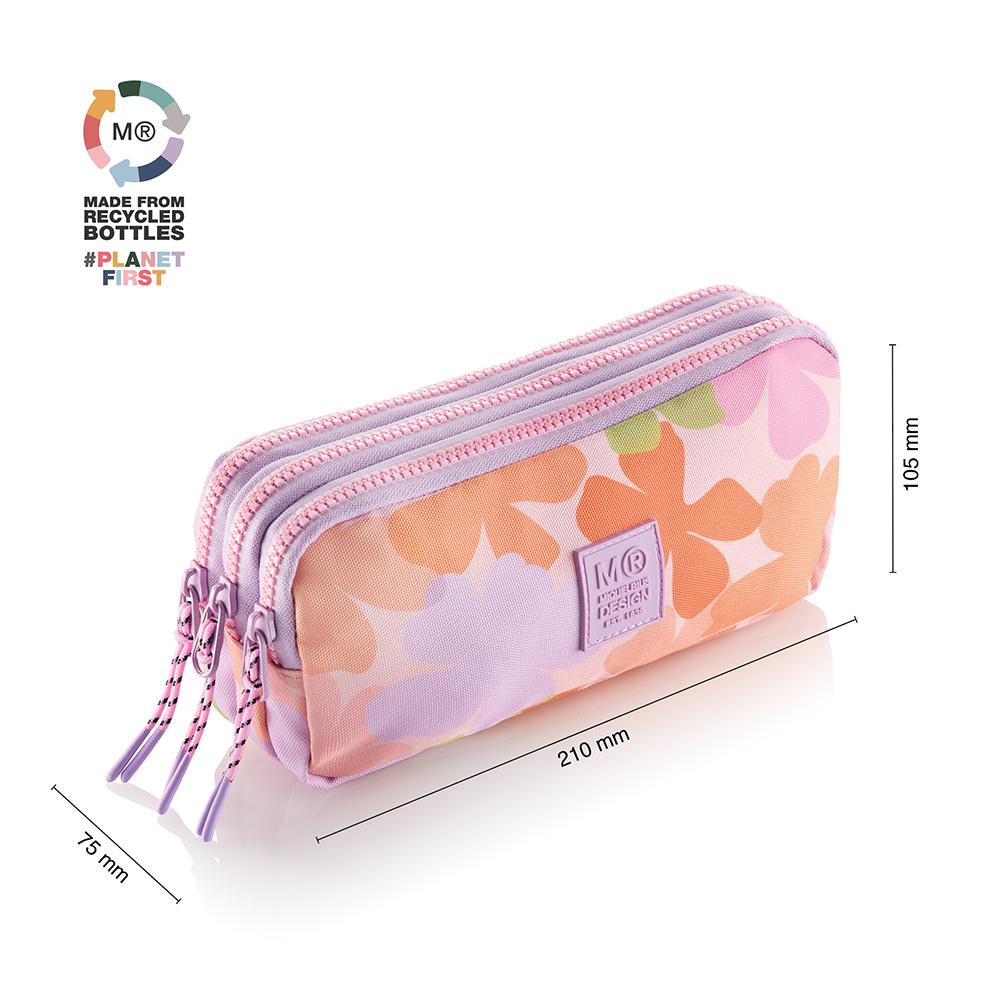 El portatodo triple modelo Acuarela dispone de tres cremalleras que facilitan la organización de tu material de escritorio, y está fabricado en poliéster reciclado (RPET) y altamente resistente. Dispone de amplia capacidad, y su diseño permite que ocupe poco espacio.Medidas: 21 x 7,5 x 10,5cm.